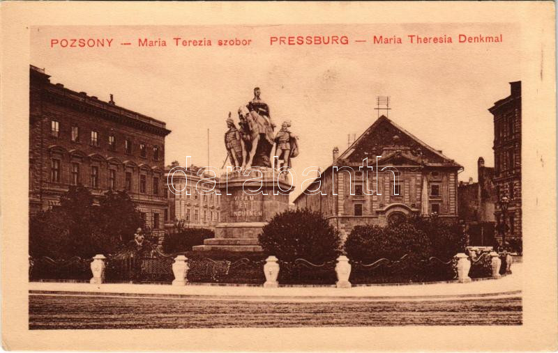 Pozsony, Pressburg, Bratislava; Mária Terézia szobor, hátoldalon eszperantó szöveg / Maria Theresia-Monument / monument, statue, with Esperanto text on the backside