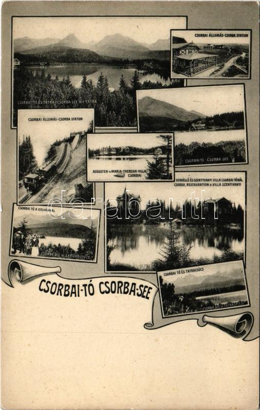 Tátra, Magas Tátra, Vysoké Tatry; mozaiklap: Csorba-tó, fogaskerekű va... https://www.darabanth.com/de/510-Fernauktion/510.0/Ansichtskarten/Slowakei~496/Tatra-Magas-Tatra-Vysoke-Tatry-mozaiklap-Csorba-to-fogaskereku-vasutallomas-gozmozdon~II3447633