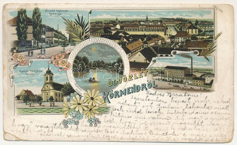 Beschreibung: Körmend, Honvéd laktanya, katolikus templom, vízimalom, gőzmalom. Art Nouveau, floral, litho (b)