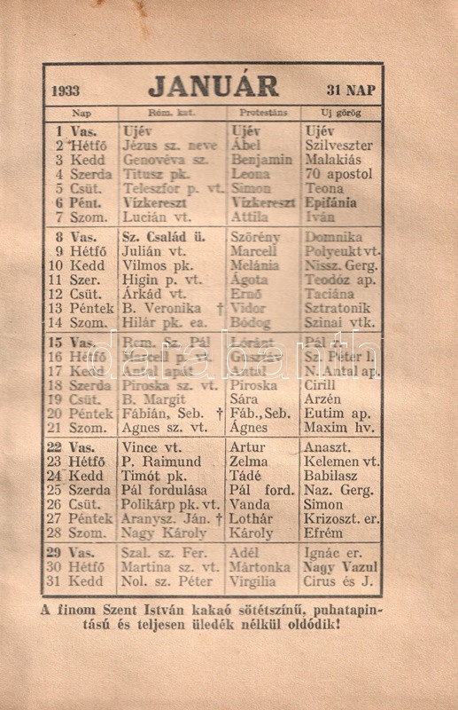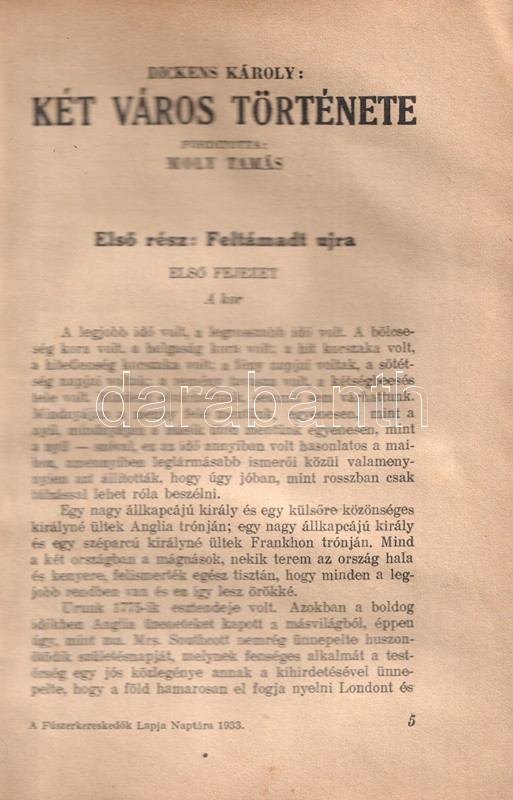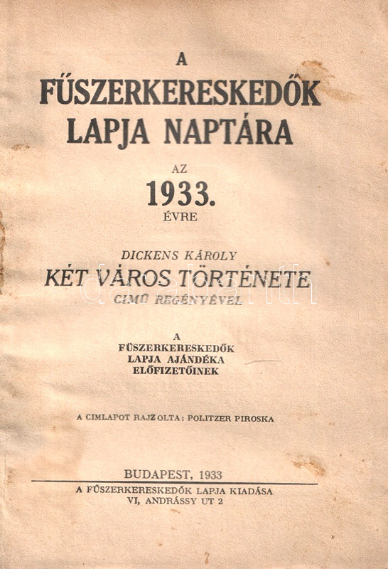 A Fűszerkereskedők Lapja Naptára az 1933. évre Dickens Károly: Két város története című teljes regényével. [A Fűszerkereskedők Lapja ajándéka előfizetőinek.]