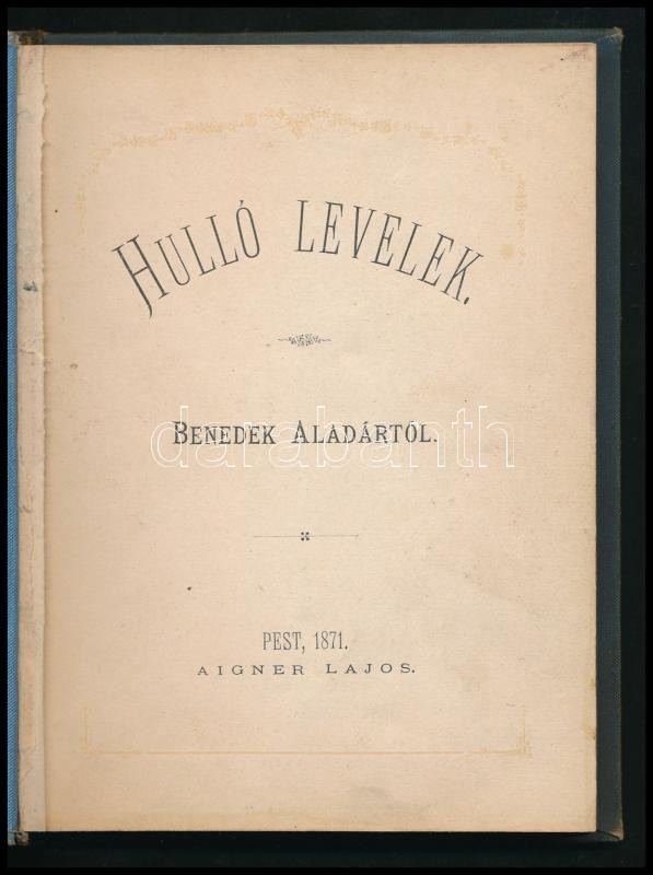 Benedek Aladár: Hulló levelek. Pest, 1871., Aigner Lajos,(Pesti Könyvnyomda Rt.-ny.), 102 p. Kiadói aranyozott egészvászon-kötés, Szalatnai és Weichner-kötés, aranyozott lapélekkel, kopott borítóval, hiányzó elülső szennylappal, az utolsó lapon ceruza nyomokkal, néhány kissé foltos lappal.