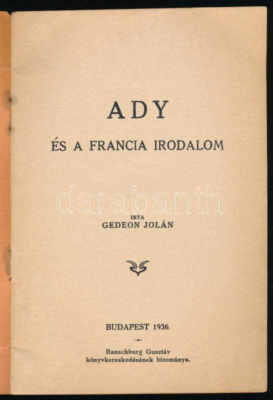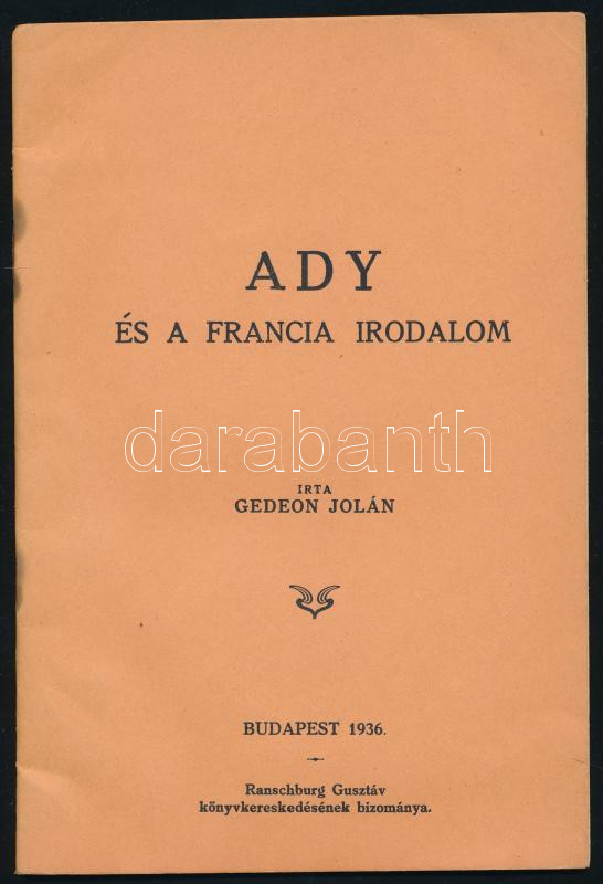 Gedeon Jolán: Ady és a francia irodalom. Bp., 1936, Ranschburg Gusztáv (Rákospalota, Vörösmarty-ny.), 29+(3) p. Egyetlen kiadás. Kiadói tűzött papírkötés, a tűzésnél kisebb foltokkal.