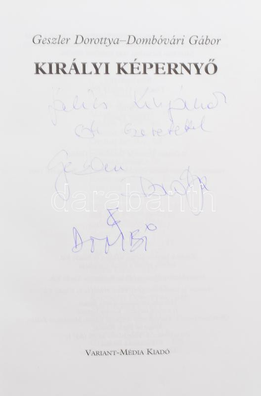 Geszler Dorottya - Dombóvári Gábor: Királyi képernyő. A szerzők, Geszler Dorottya (1970-) műsorvezető és Dombóvári Gábor (1944-) műsorvezető, újságíró, riporter, szerkesztő által Jálics Kinga (1943-2019) kulturális újságíró, szerkesztő részére DEDIKÁLT példány. [Bp.], 2001, Variant-Média Reklám és Kiadó Kft. Díner Tamás fekete-fehér fotóival illusztrált. Kiadói kartonált papírkötés.