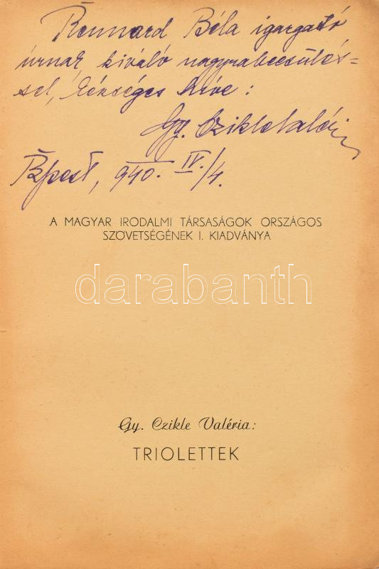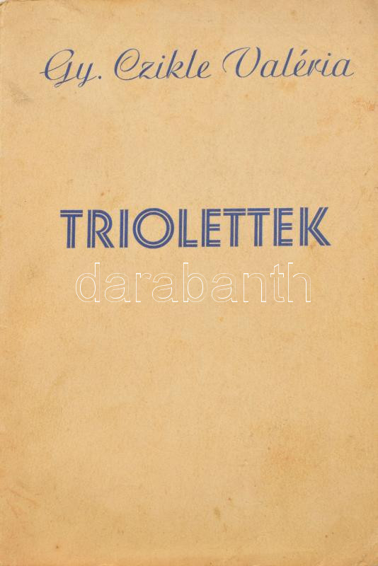 Gy. Czikle Valéria: Triolettek. DEDIKÁLT! Bp., 1940, Magyar Irodalmi Társaságok Országos Szövetsége, 116+6 p. Kiadói papírkötés, kopott, foltos borítóval, a gerinc kissé elvált a borítótól, néhány aláírással.