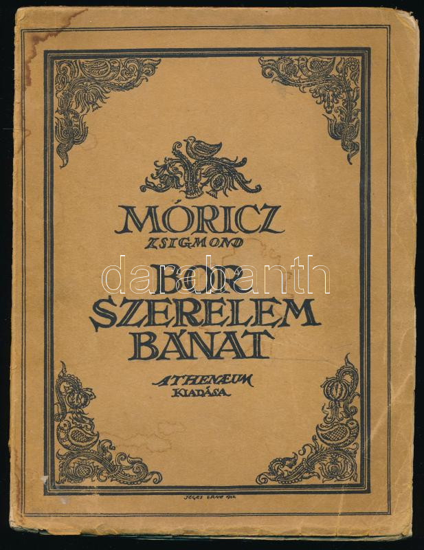Móricz Zsigmond: Vidéki hÃrek és más elbeszélések. Bp., 1917, Táltos (Világosság-ny.), 203+(5) p. ElsÅ‘ kiadás. Haranghy JenÅ‘ illusztrációival. A Bor, szerelem, bánat c. mű (Jeges ErnÅ‘ által tervezett) papÃrborÃtójába kötve, foltos, sérült borÃtóval és gerinccel, helyenként kissé sérült lapokkal, bejegyzésekkel, firkákkal, egy kijáró lappal.
