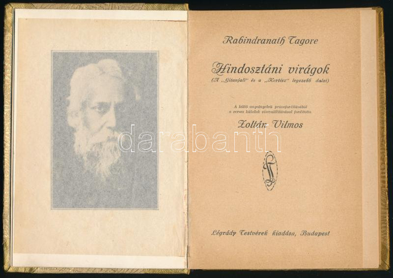 Rabindranath Tagore: Hindosztáni virágok. (A ,,Gitanjali" és a ,,Kertész" legszebb dalai). A költő angolnyelvű prózafordításából a verses külalak visszaállításával ford.: Zoltán Vilmos. Bp., [1922], Légrády, 1 (címkép) t.+ 88 p. Első magyar kiadás. Átkötött félvászon-kötésben, jó állapotban, korabeli tulajdonosi bejegyzéssel.