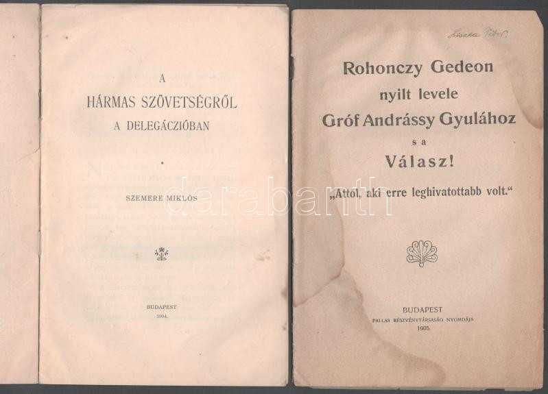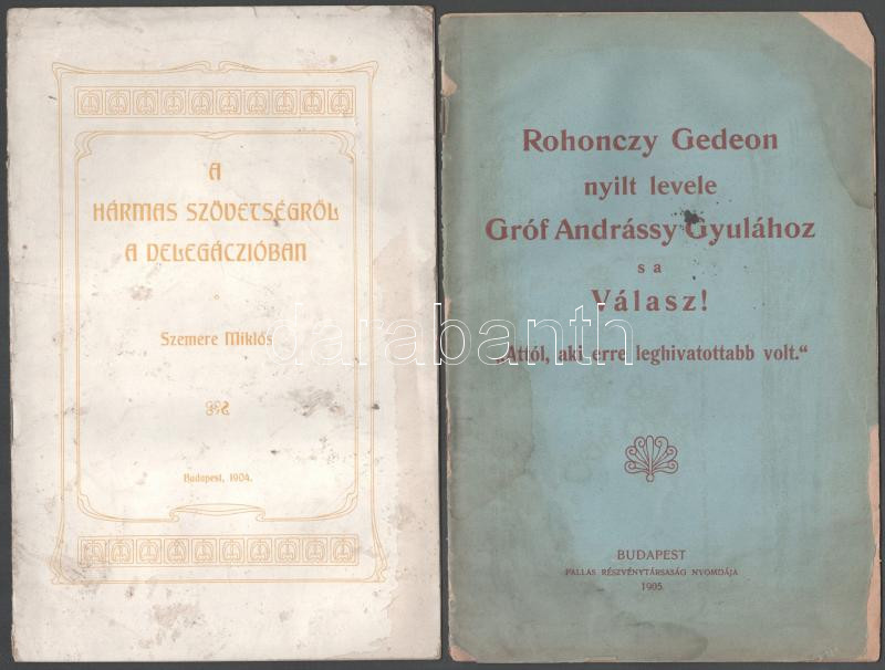 Ritka röpiratok: Szemere Miklós: A Hármas Szövetségről a delegáczióban. Bp., 1904. (Légrády ny.) 18 p. Tűzött, kiadói kissé sérült borítóban.