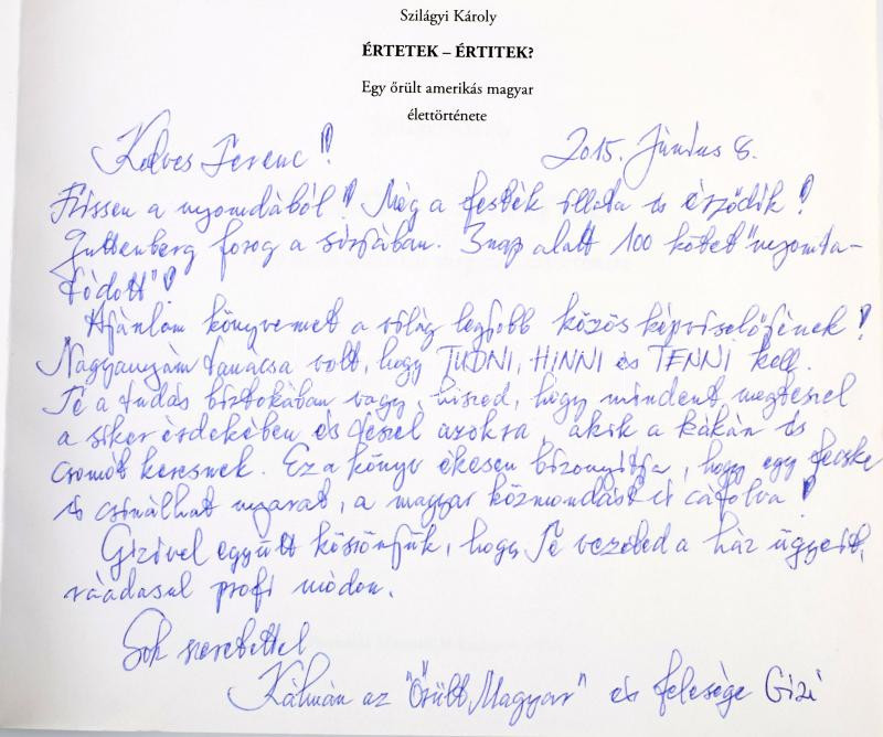 Szilágyi Károly: Értetek - Értitek? Egy őrült amerikás magyar [Lőrincz Kálmán] élettörténete. Lőrincz Kálmán által dedikált példány (hosszú dedikációval, ,,[...] Sok szeretettel Kálmán az "Őrült Magyar" és felesége Gizi"). Bp., 2014, Pannónia Nyomda, 151+(1) p. Kiadói papírkötés.