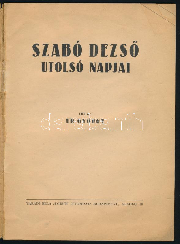 Úr György: Szabó Dezső utolsó napjai. Bp., [1947], szerzői kiadás (Vár... https://www.darabanth.com/de/510-Fernauktion/510.0/Bucher/Bucher-Andere-kuriositaten~785/Ur-Gyorgy-Szabo-Dezso-utolso-napjai-Bp-1947-szerzoi-kiadas-Varadi-Bela-Forum-ny~II3445595