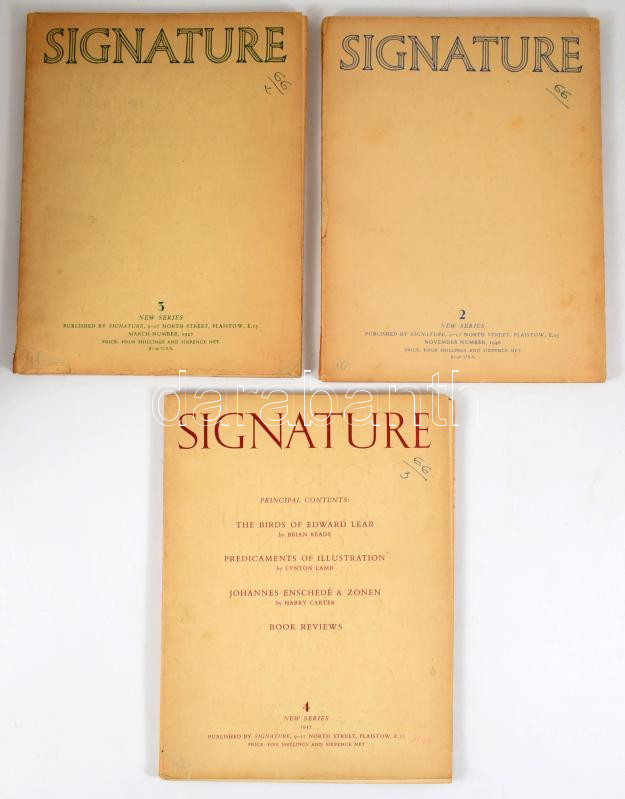 1946-1947 Signature folyóirat 3 száma: New Series 2-3-4. A Quadrimestrial of Typography and Graphic Art. Edited by Oliver Simon. London, Signature. Angol nyelven. Gazdag képanyaggal illusztrált. Kiadói papírkötések, az egyik füzet elvált a borítótól.