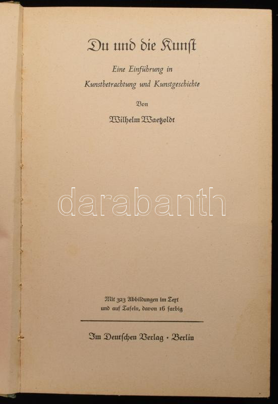 Du und die Kunst. Eine Einführung in Kunstbetrachtung und Kunstgeschichte von Wilhelm Waetzoldt. Berlin, 1938, Deutschen Verlag. Német nyelven. Gazdag ábra- és képanyaggal illusztrált. Kiadói félvászon-kötés, sérült papír védőborítóval.