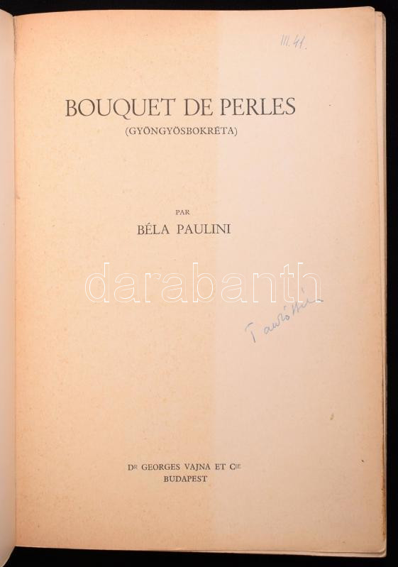Paulini Béla: Bouquet de perles (Gyöngyösbokréta). Bp., 1937, Athenaeum. Kiadói papírkötés, külső borítás eleje szakadt, egyébként jó állapotban, 64p. gazdag képanyaggal