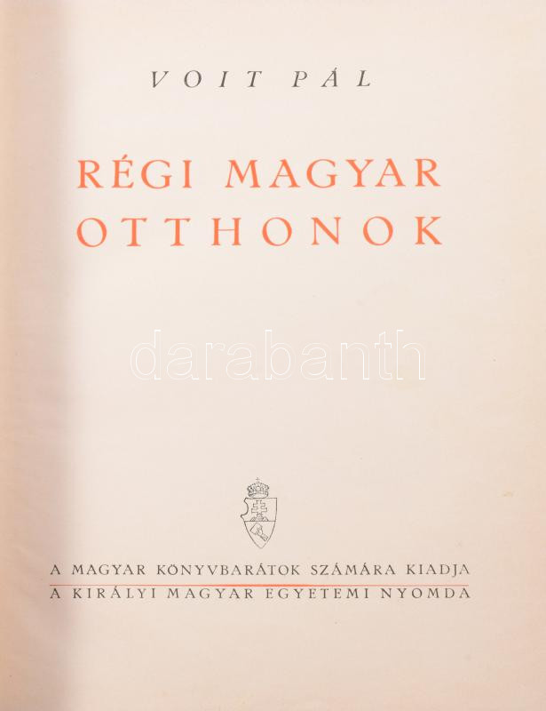 Voit Pál: Régi magyar otthonok. Bp., [1943], Kir. M. Egyetemi Nyomda, 319+1 p. Gazdag fekete-fehér képanyaggal illusztrálva. Kiadói aranyozott félvászon-kötés, kopottas állapotban.