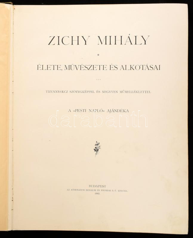 Zichy Mihály élete, művészete és alkotásai. Tizennyolc szövegképpel és negyven műmelléklettel. A Pesti Napló ajándéka. Bp., 1902, Athenaeum, 76 p.+ 37 t. (hiányos). Számos szövegközti és egészoldalas illusztrációval. Kiadói egészvászon-kötés, viseltes, foltos borítóval, hiányzó előzéklappal