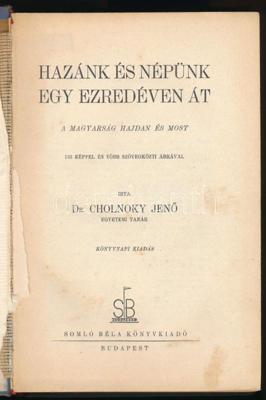 Cholnoky Jenő: Hazánk és népünk egy ezredéven át. A magyarság hajdan és most. Könyvnapi kiadás. Bp., é.n. [193?], Somló Béla, 213+(3) p.+ 32 (kétoldalas, fekete-fehér képek) t. Kiadói aranyozott egészvászon-kötés, kissé kopottas borítóval, kissé sérült gerinccel, hiányzó elülső szennylappal, helyenként kissé foltos lapokkal.