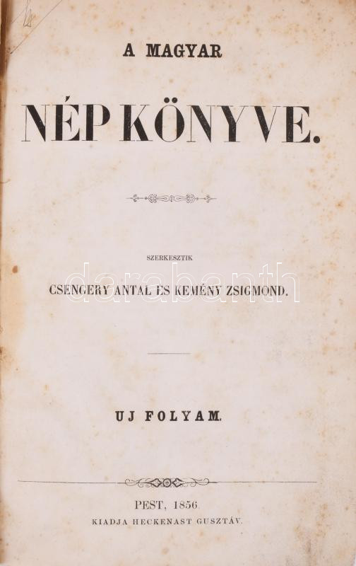 Csengery Antal - Kemény Zsigmond (szerk.): A magyar nép könyve. Új évfolyam. Pest, 1856, Heckenast. Félvászon kötés, kötéstáblák sérültek, kopottas állapotban.