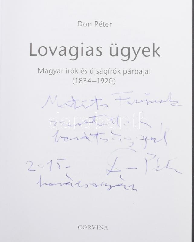 Don Péter: Lovagias ügyek. Magyar írók és újságírók párbajai. (1834-19... https://www.darabanth.com/de/510-Fernauktion/510.0/Bucher/Bucher-Geschichte~769/Don-Peter-Lovagias-ugyek-Magyar-irok-es-ujsagirok-parbajai-1834-1920-DEDIKALT-Bp-~II3193026