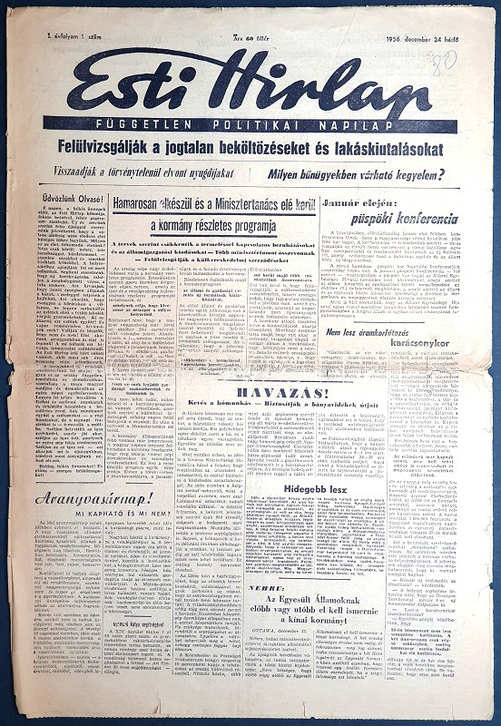 [Folyóirat, 1956.] Esti Hírlap. Független politikai napilap. I. évfolyam, 1. szám. (1956. december 24.)