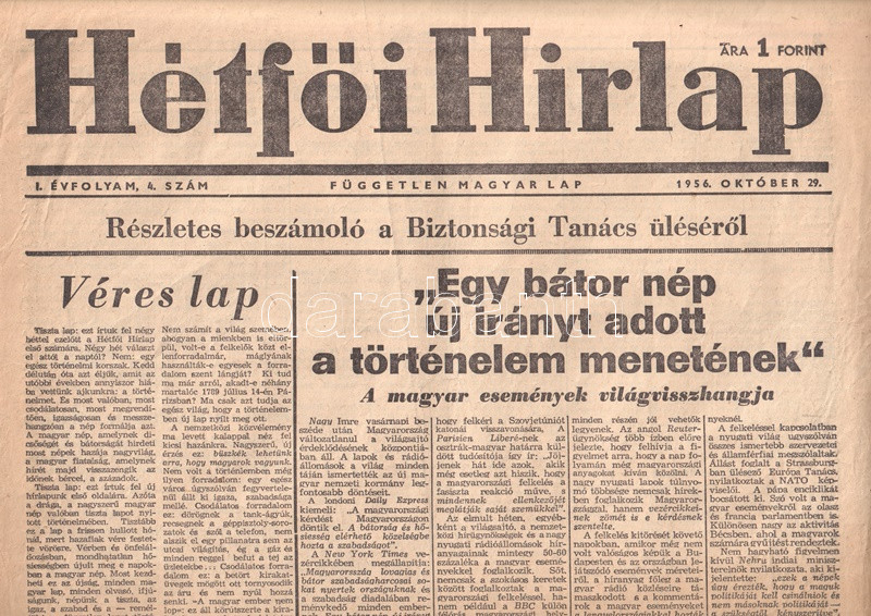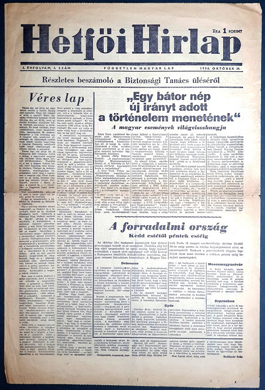 [Folyóirat, 1956.] Hétfői Hírlap. Független magyar lap. Főszerkesztő: Boldizsár Iván. I. évfolyam, 4. szám. (1956. október 29.)