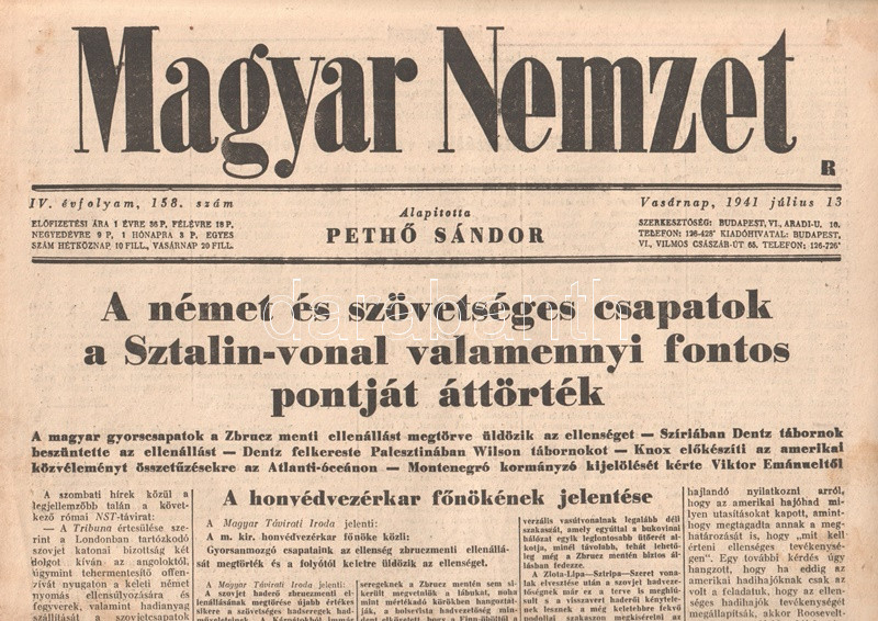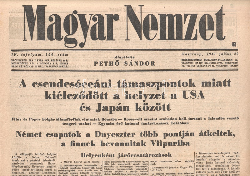 Magyar Nemzet IV/164. (1941. július 20.) 4 p., 9-10 p. Német csapatok a Dnyeszter több pontján átkeltek, a finnek bevonultak Viipuriba. A csendes-óceáni támaszpontok miatt kiéleződött a helyzet az USA és Japán között. Egymást érő katonai tanácskozások Tokióban. Kik a szovjetrendszer belső ellenségei?