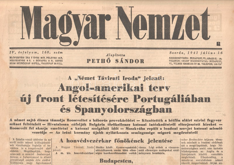 Magyar Nemzet IV/160. (1941. július 16.) 4 p. A Német Távirati Iroda jelenti: Angol-amerikai terv új front létesítésére Portugáliában és Spanyolországban. A német sajtó élesen támadja Rooseveltet a háborús provokációért.