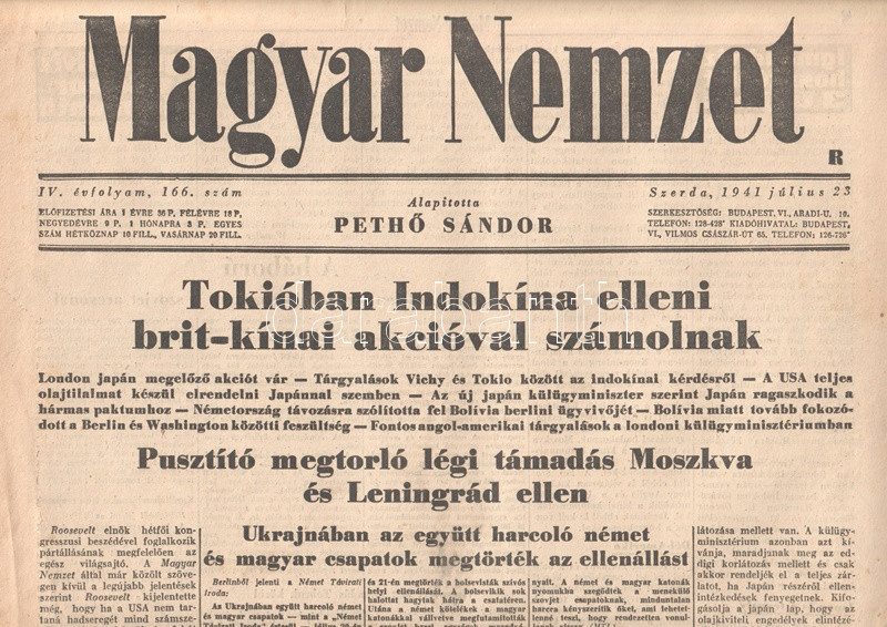 Magyar Nemzet IV/166. (1941. július 23.) 4 p. Pusztító megtorló légi támadás Moszkva és Leninigrád ellen. Ukrajnában az együtt harcoló német és magyar csapatok megtörték az ellenállást. Sztalin fia fogságba esett. Angol katonai bizottság a Kaukázusban. Japán nagy cselekedetek küszöbén áll. Az amerikai közvélemény reakciója a német-szovjet háborúra. Magyarország és az emigráns Benes-kormány. Háborús térképek: Szovjetunió (kézi színezéssel). Francia-Indokína és Sziám.