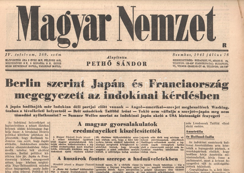 Magyar Nemzet IV/168. (1941. július 25.) 4 p. Japán egységek Indokínában elfoglaltak két tengerészeti és hat légi támaszpontot. Éles amerikai sajtótámadások Vichy ellen. Nagy arányú katonai előkészületek a Hawaii-szigeteken, Szingapúrban és Holland-Indiában. A "Völkischer Beobachter" Magyarország szerepéről a háborúban. Háborús térképek: az indokínai hadszíntér három térképe.