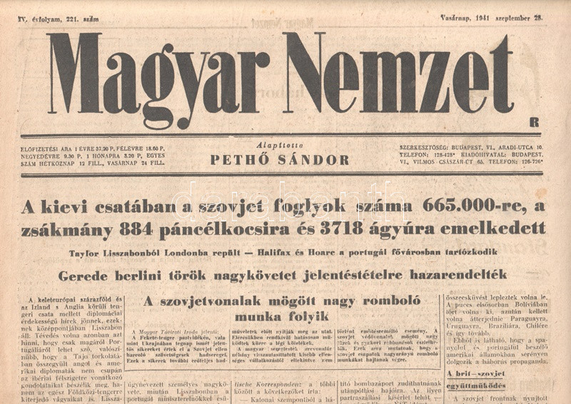 Magyar Nemzet IV/221. (1941. szeptember 28.) 4 p. A kijevi csatában a foglyok száma 665,000-re emelkedett. A szovjetvonalak mögött nagy romboló munka folyik. A Führer, a Duce és Konoye táviratváltása a háromhatalmi egyezmény első évfordulóján. Az irodalmi folyóirat problémája.