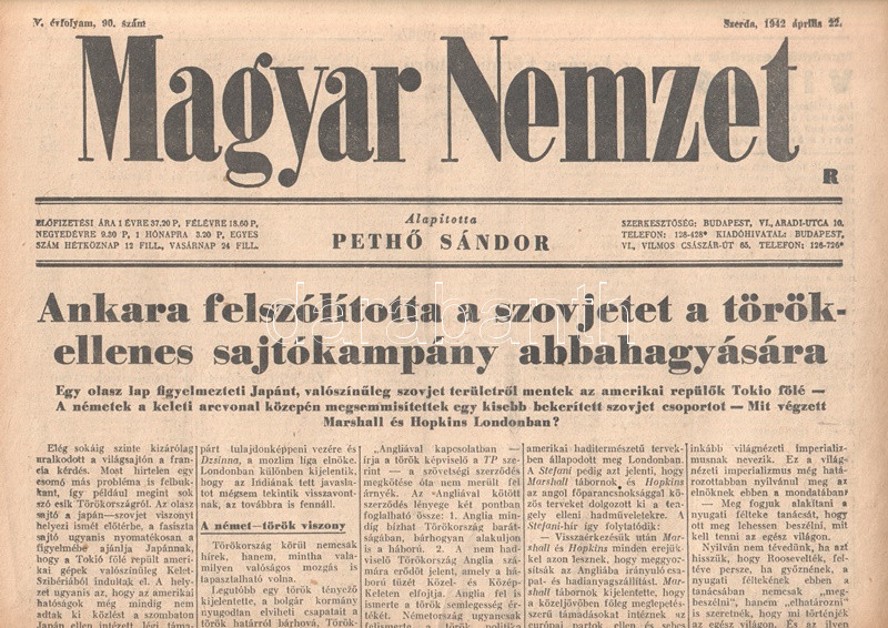 Magyar Nemzet V/90. (1942. április 22.) 4 p. Német vélemény Kállay beszédéről. Szálasi az Imrédy-féle politikai kft. csődjéről. A Führer kiáltványa. Ankara felszólította a szovjetet a törökellenes sajtókampány abbahagyására.