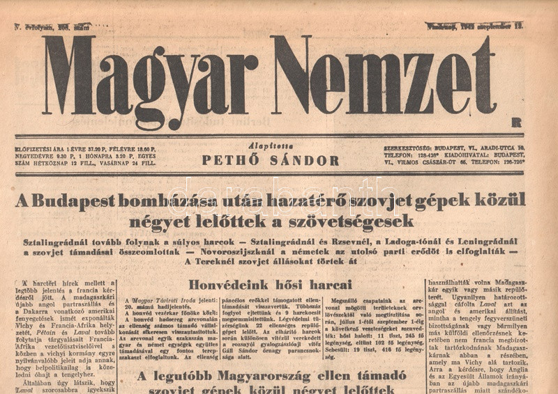 Magyar Nemzet V/208. (1942. szeptember 13.) 6 p. A Budapest bombázása után hazatérő szovjet gépek közül négyet lelőttek a szövetségesek. Sztálingrádnál súlyos harcok. Mibe kerültek az angol légi támadások? A Duce a kikötői tűzoltógyakorlaton. Az indiai zavargás. Gabon afrikai gyarmat Anglia hatalmában.