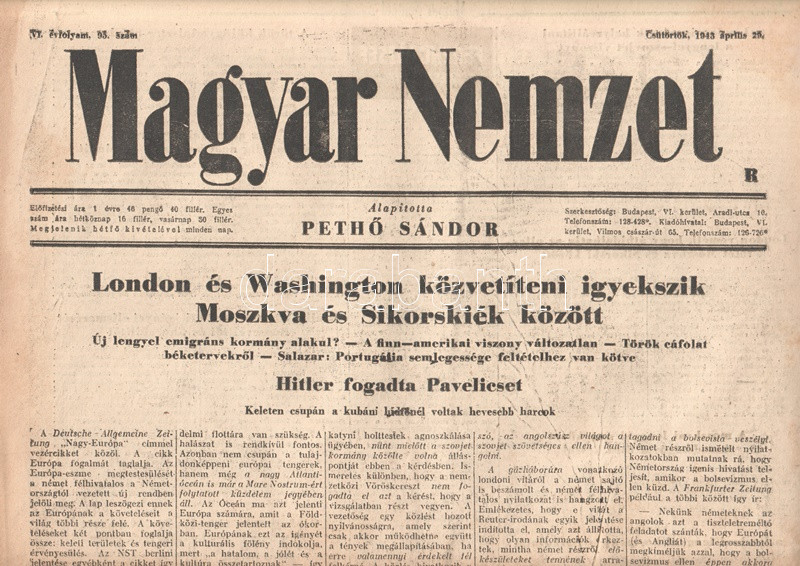 Magyar Nemzet VI/93. (1943. április 29.) 4 p. London és Washington közvetíteni igyekszik Moszkva és Sikorskiék között. Új lengyel emigráns kormány alakul. London igyekszik helyreállítani a lengyel-szovjet viszonyt. Hitler fogadta Ante Pavelics horvát államfőt. Keleten csupán a kubáni hídfőnél voltak hevesebb harcok. Háborús térkép: Tuniszi hadszíntér.