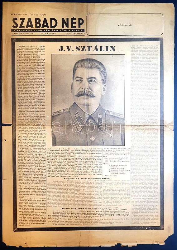 Joszif Visszarionovics Sztálin (1878-1953), a Szovjetunió Minisztertanácsának elnöke, a Szovjetunió Kommunista Pártja Központi Bizottságának titkára 1953. március 5-én elhunyt. A Szabad Nép egyleveles, gyászkerettel övezett, Sztálin portréjával díszített, egyetlen oldalán nyomott, így falragasznak is alkalmas különkiadása az SZKP Központi Bizottságának nevében búcsúzik a generalisszimusztól, a munkások, kolhozparasztok és értelmiségiek forrón szeretett vezetőjétől. A gyászlevél felsorolja a vezető múlhatatlan érdemeit, méltatja a szovjet állam megteremtésében, a második világháború megnyerésében betöltött szerepét. A gyászlevél mellett Sztálin orvosi zárójelentése, a szovjet egészségügyi miniszter, valamint más szovjet akadémikusok aláírásával. Jobb oldalt ismeretlen szerzőtől származó nekrológ, amely megrendült hangon nevezi a szovjet vezért minden élők legnagyobbikának.
