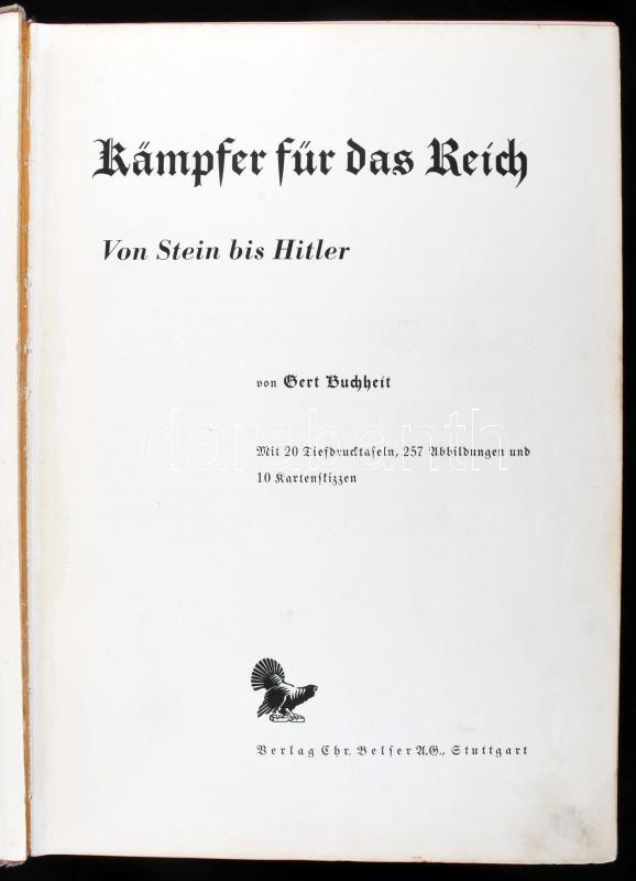 Gert Buchheit: Kämpfer für das Reich. Von Stein bis Hitler. Mit 20 Tiefdrucktafeln, 257 Abbildungen und 10 Kartenskizzen. Stuttgart,(1933.),Verlag Chr. Belser A. G.,6+522 p.+19 t. Német nyelven. Gazdag képanyaggal illusztrált. Kiadói egészvászon-kötés, egy tábla (Hitler kép) hiányzik, kissé kopott, kissé foltos borítóval.