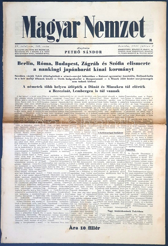 [II. Világháború] Magyar Nemzet. Pethő Sándor riportlapja. IV. évfolyam, 148. szám. (Napilap, 1941 július 2.) "Berlin, Róma, Budapest, Zágráb és Szófia elismerte a nankingi japánbarát kínai kormányt -- A németek több helyen átlépték a Dünát és Minszken túl elérték a Berezinát, Lembergen is túl vannak -- A háború -- Amerika világtörténelmet tanul -- Kolozsvári ekhó". Félbehajtva, jó állapotban.
