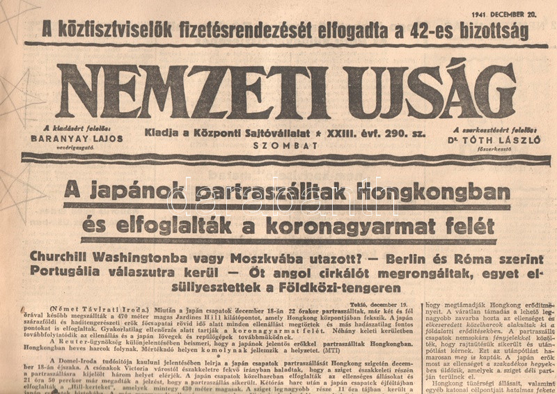 [II. Világháború] Nemzeti Ujság. 1941. december 20. (Napilap, XXIII. évfolyam, 290. szám) "A köztisztviselők fizetésrendezését elfogadta a 42-es bizottság -- A japánok partraszálltak Hongkongban és elfoglalták a koronagyarmat felét -- Az egész országban bevezetik a liszt- és kenyérjegyrendszert" Félbehajtva, jó állapotban.