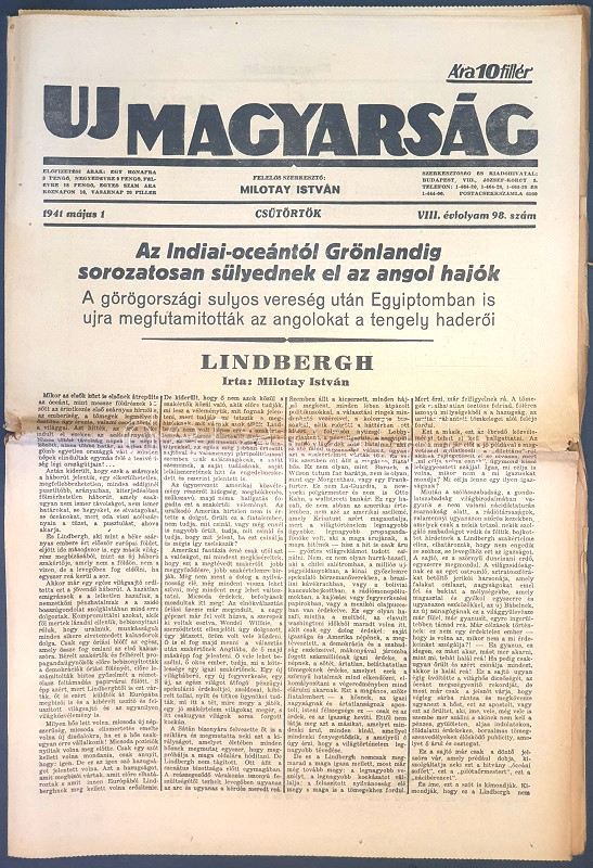 [II. Világháború] Uj Magyarság. Felelős szerkesztő: Milotay István. 1941. május 1. (Napilap, VIII. évfolyam, 98. szám) "Az Indiai-oceántól Grönlandig sorozatosan süllyednek el az angol hajók -- Bárdossy László fogadta a ruszin fiatalság népi mozgalmának hüségküldöttségét -- Ilyen volt Athén a német bevonulás reggelén -- Pillanatképek a felszabadult bácskából" Félbehajtva, jó állapotban.
