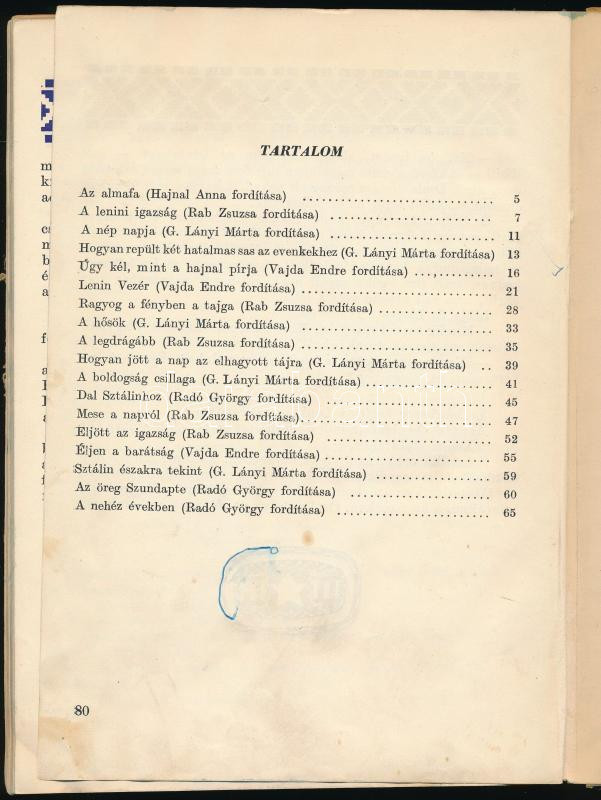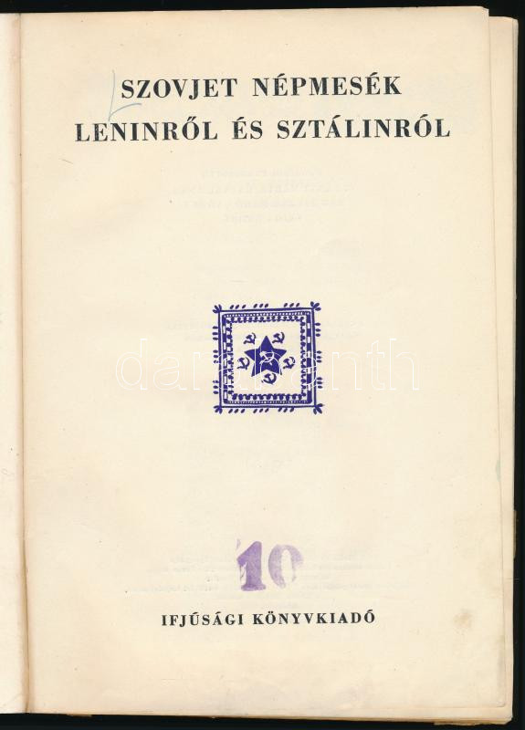 Szovjet népmesék Leninről és Sztálinról. Ford.: G. Lányi Márta, Hajnal Anna, Rab Zsuzsa, Radó György, Vajda Endre. Bp., 1953., Ifjúsági Könyvkiadó, 80 p. + 2 tábla (színes). A címlap, a fejlécek és a záródíszek szovjet népi díszítések nyomán készültek. A képszerkesztő: Tevan Andor. Kiadói félvászon-kötés, az eredeti borítóra "ABC Olvasókönyv római katholikus tanulók részére c. könyv borítóját kasírozták, kopott, kissé foltos borítóval, a gerincen kis sérüléssel.