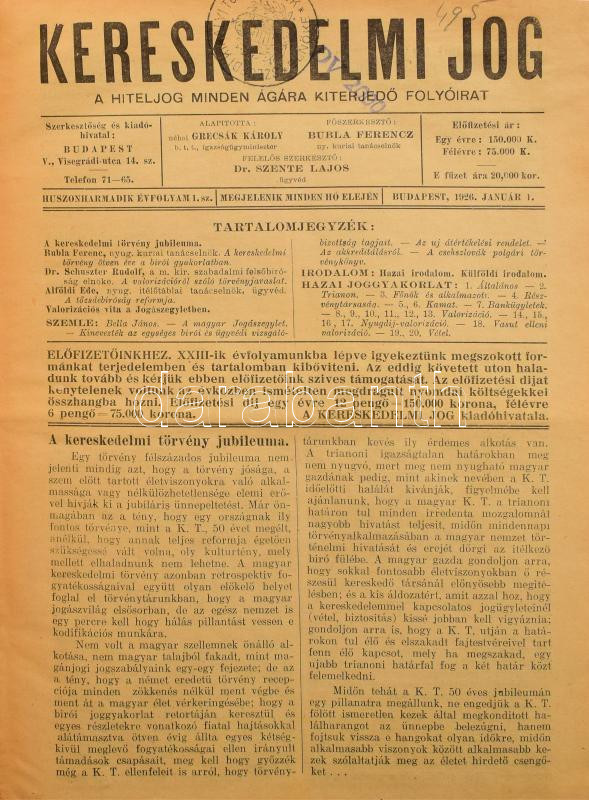 Kereskedelmi jog. A hiteljog minden ágára kiterjedő folyóirat. Főszerkesztő: Bubla Ferenc. XXIII évf. 1-11. sz. és XXIV évf. (1927) 1-11. sz. + Kereskedelmi jog. A hiteltörvények minden ágára kiterjedő folyóirat. Főszerkesztő: Grecsák Károly. Felelős szerkesztő: Bender Béla. V. évf. (1908), 1-24. sz.. Félvászon kötésekben, márványozott lapélekkel, intézményi bélyegzőkkel, 1908., évi kötet gerince sérült, 1927. évi kötet borítója sérült.