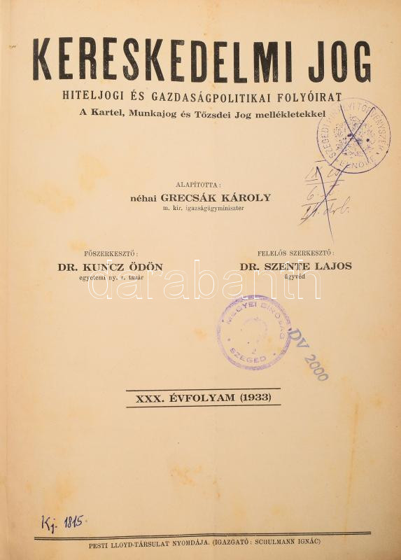 Kereskedelmi jogi folyóirat tétel: A Kereskedelmi jog c. folyóirat 190... https://www.darabanth.com/de/510-Fernauktion/510.0/Bucher/Bucher-Jura~768/Kereskedelmi-jogi-folyoirat-tetel-A-Kereskedelmi-jog-c-folyoirat-1908-1938-kozotti-evfolyamo~II3426897