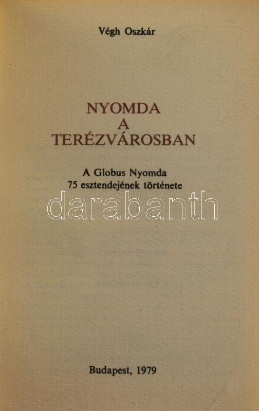 Végh Oszkár: Nyomda a Terézvárosban. A Globus Nyomda 75 esztendejének története. (Minikönyv). Bp., 1979, Ifjúsági Lapkiadó Vállalat. Kiadói műbőr-kötés, a borítón apró sérülésekkel. Megjelent 500 példányban. Kereskedelmi forgalomba nem került.