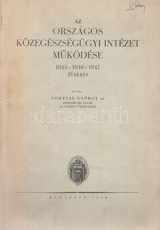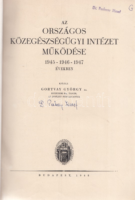 Gortvay György (szerk.): Az Országos Közegészségügyi Intézet működése 1945-1946-1947 években. Budapest, 1948. (Szikra Irodalmi és Lapkiadóvállalat és Nyomda Rt.) 1 t. (címkép) + 499 + [1] p. Egyetlen kiadás. Oldalszámozáson belül szövegközti felvételekkel, grafikonokkal illusztrált statisztikai-népegészségügyi kötet. A címoldalon, az első borítón, a belső borítókon és a belív néhány oldalán régi tulajdonosi bélyegzés. Fűzve, kiadói borítóban.
