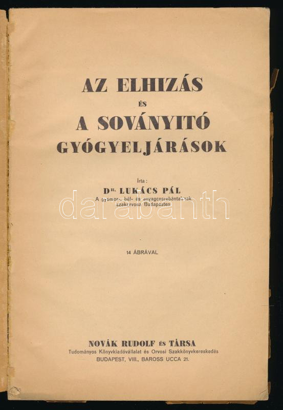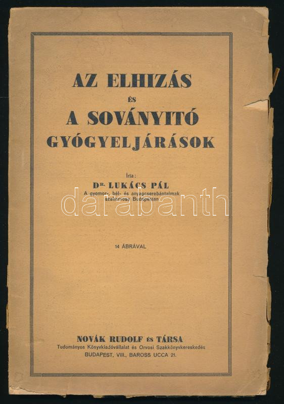 Lukács Pál: Az elhízás és soványító gyógyeljárások. Bp., [1932], Novák Rudolf és Társa, 125+(3) p. Kiadói papírkötés, sérült borítóval és gerinccel, foltos, felvágatlan példány.