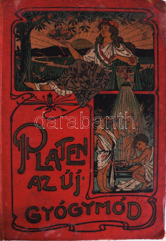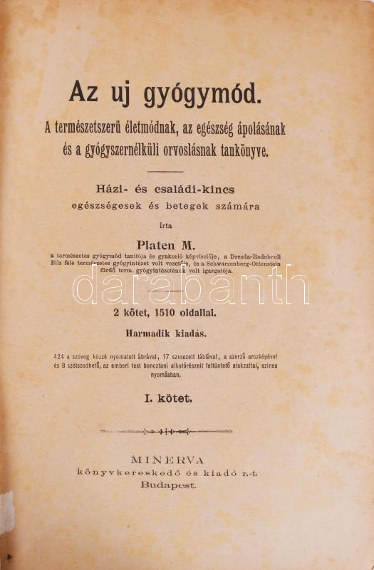Platen, M[oritz]: Az új gyógymód. A természetszerű életmódnak, az egészség ápolásának és a gyógyszernélküli orvoslásnak tankönyve. Házi- és családi-kincs egészségesek és betegek számára. I-II. köt. Bp., [1904], Minerva. Harmadik kiadás. Szövegközti illusztrációkkal, színes táblákkal és mellékletekkel. Kiadói illusztrált, festett, szecessziós egészvászon-kötés, Kiss Valdemár-kötés, viseltes állapotban, kopottas, foltos borítókkal, helyenként foltos lapokkal, a II. kötet sérült borítóval és gerinccel, részben szétváló fűzéssel, kijáró lapokkal (hiányok előfordulhatnak).