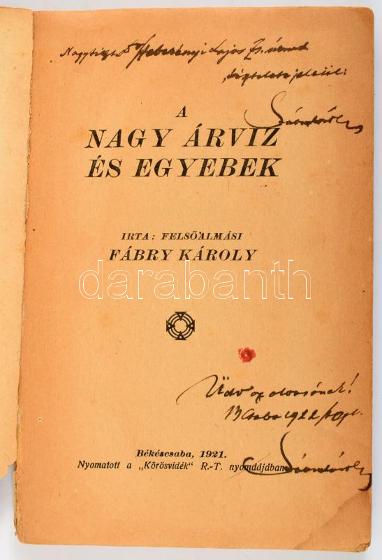 Fábry Károly, felősalmási: A nagy árvíz és egyebek. (A borítón: A csabai nagy árvíz és egyebek.) A szerző, Fábry Károly (1851-1925) békéscsabai ügyvéd, író, publicista által dedikált példány (dupla dedikációval). Békéscsaba, 1921, ,,Körösvidék" Rt.-ny., 224 p. Kiadói papírkötés, viseltes állapotban, sérült borítóval és gerinccel, szétváló fűzéssel, helyenként kisebb ázásnyomokkal. Ritka helytörténeti mű!