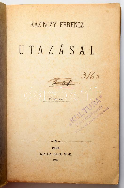 Kazinczy Ferencz utazásai. Uj lenyomás. Pest, 1873. Ráth Mór. 261+(3) p. Korabeli, papírkötésben