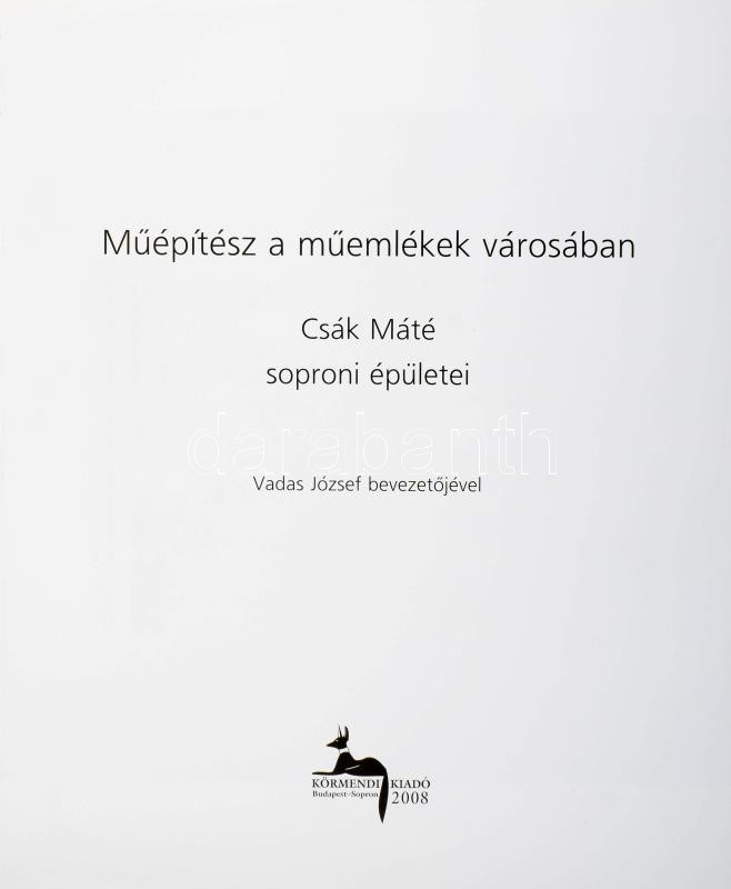 Műépítész a műemlékek városában. Csák Máté soproni épületei. Vadas József bevezetőjével. Bp.-Sopron, 2008, Körmendi Kiadó, 111+1 p. Gazdag képanyaggal illusztrált. Kiadói kartonált papírkötés, jó állapotban.