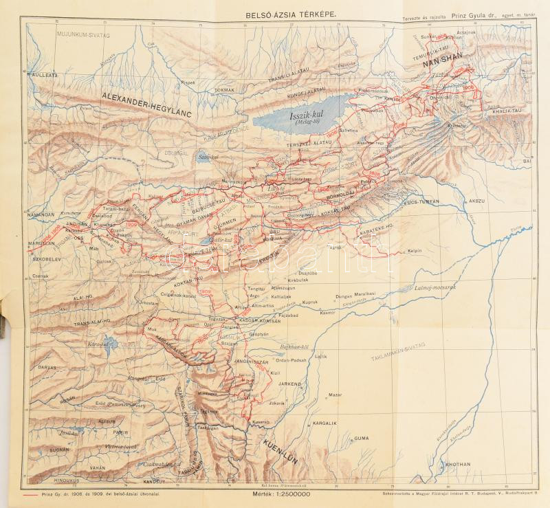 Princz Gyula: Utazásaim Belső-Ázsiában. Bp., 1911, Kertész József Könyvnyomdája, XVI+333+11 p. Szövegközti, és egészoldalas fekete-fehér fotókkal, rajzokkal, illusztrációkkal, két színes műmelléklettel, egy kihajtható térképpel. Kiadói egészvászon-kötés, kissé sérült gerinccel, előzéklapon bejegyzésekkel