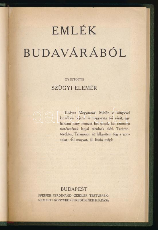 Szügyi Elemér: Emlék Budavárából. Gyűjtötte: - - . Bp., [1930], Pfeifer Ferdinánd, 130 p. (eredetileg 144 p.) Egyetlen kiadás. Gazdag fekete-fehér képanyaggal illusztrálva. Átkötött egészvászon-kötésben, egy-két lap kissé sérült, az utolsó 7 lap hiányzik.