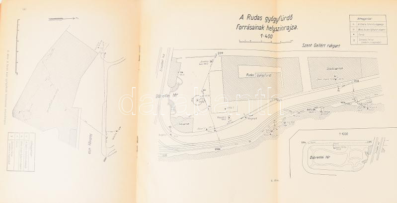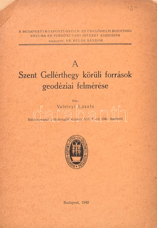 Valtinyi László: A Szent Gellérthegy körüli források geodéziai felmérése. Különlenyomat a Hidrológiai Közlöny XXI. 7-12. 1941. füzetéből. Bp., 1942. Budapesti Központi Gyógy- és Üdülőhelyi Bizottság Rheuma és Fürdőkutató Intézet, 1+140-145+1 p. 1 (kihajtható térkép-vázlat, 'A Rudas gyógyfürdő forrásainak helyszínrajza', 1:400) t. Kiadói papírkötés, a borítón kis hiánnyal.