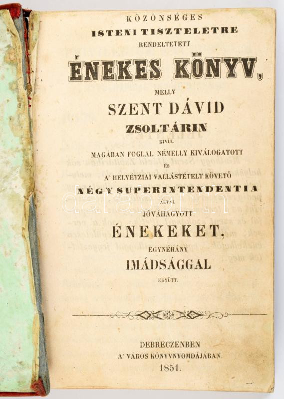 Közönséges isteni tiszteletre rendeltetett énekes könyv - melly Szent Dávid zsoltárin kivül magába foglal némelly kiválogatott és a' helvétziai... Debrecen, 1851. Városi nyomda. 508 + 44 p. Korabeli, kissé sérült bársony kötésben